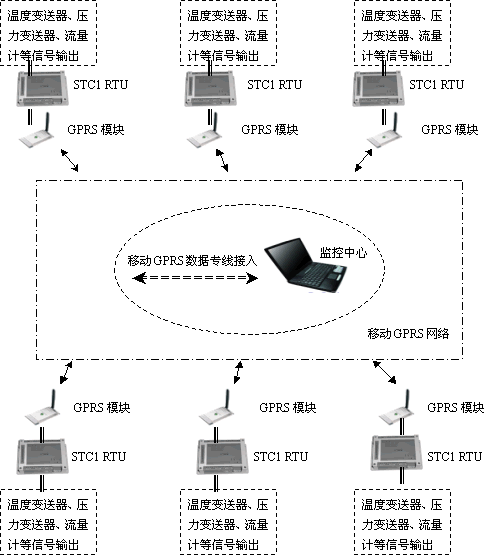 通訊網(wǎng)絡(luò)可以為光纖、雙絞線等有線和微波、GPRS等無(wú)線方式,在山東某地級(jí)市的熱網(wǎng)監(jiān)控系統(tǒng)項(xiàng)目中采用的是GPRS方式。