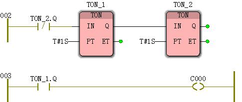 EN上升沿有效,可用兩個(gè)延時(shí)接通定時(shí)器產(chǎn)生一個(gè)脈沖串,50%占空比,脈寬1秒(通過(guò)PT引腳可修改),脈沖串在TON_1.Q端產(chǎn)生,用于控制線圈C000。![]() |