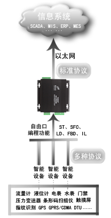 用戶通過靈活方便的編程環(huán)境,利用騰控可編程協(xié)議技術(shù),將各種協(xié)議轉(zhuǎn)換成標(biāo)準(zhǔn)的Modbus TCP協(xié)議,完成與上位機統(tǒng)一通信。